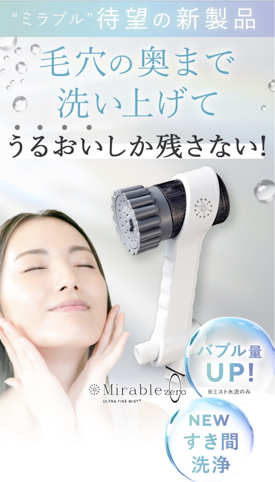ミラブルzeroは、ウルトラファインバブルを活かした次世代型のシャワーヘッドです。大きな特長は、用途に応じて使い分けられる3つの水流を搭載していること。顔まわりにやさしい「トルネードミスト」、頭皮や毛穴汚れにアプローチしやすい「スプラッシュストレート」、口元や細かなすき間洗浄にも使いやすい「リングストレート」があり、ただ浴びるだけのシャワーではなく、毎日の洗浄ケアを一段上げてくれるのが魅力です。